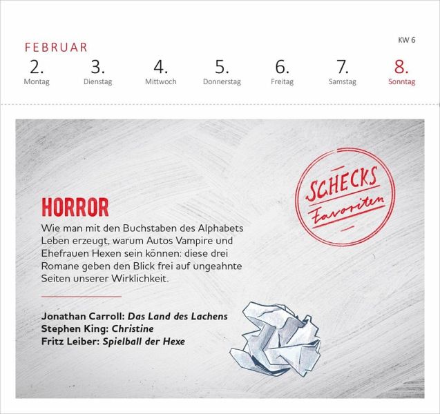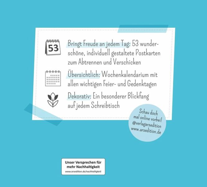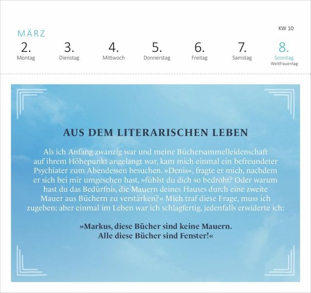Für alle, die in die spannende Welt der Bücher eintauchen möchten, ist der Literaturkalender von Denis Scheck genau das Richtige. Dieser einzigartige Kalender mit Postkarten begleitet Literaturfans mit einer Fülle von Anekdoten, Tipps und Lieblingszitaten durch das Jahr. Ob humorvolle Sprüche, wertvolle Leseempfehlungen oder treffende Verrisse: Mit Schecks Buchtipps entdeckst du jeden Tag eine neue Seite der Literatur. Mit dem praktischen Wochenkalendarium behält man stets den Überblick, egal ob im Büro oder zu Hause. Die stilvoll gestalteten Postkarten lassen sich an der Perforation heraustrennen und können so an liebe Menschen verschickt werden.