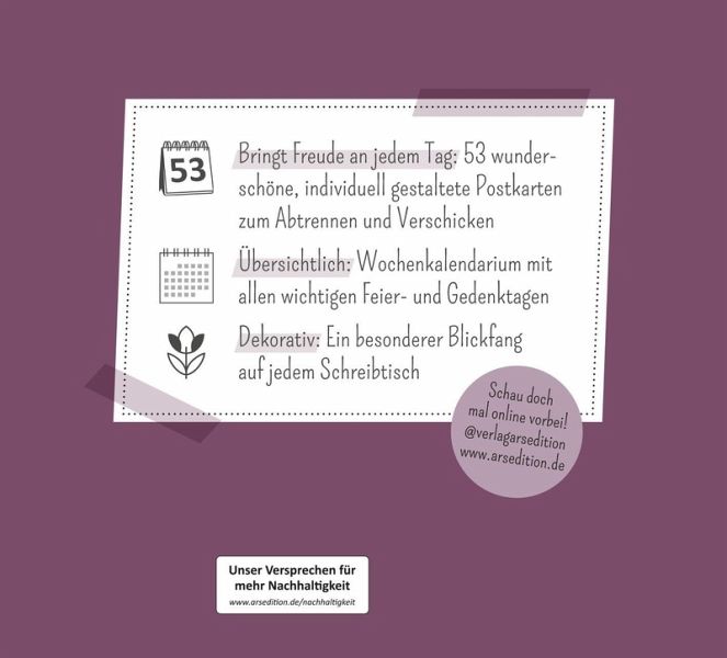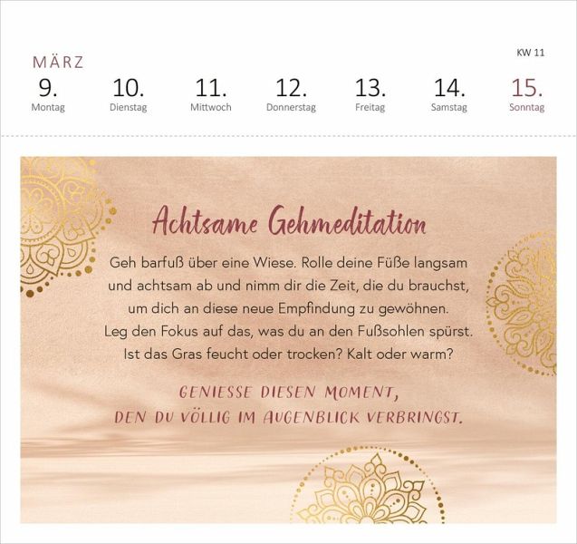 Mit dem praktischen Wochenkalendarium behältst du den Überblick, egal ob im Büro, Homeoffice oder zu Hause, und die Postkarten kannst du heraustrennen und verschicken. Du möchtest aufmerksamer, dankbarer, gelassener und glücklicher durchs Leben gehen? Dieser Aufstellkalender erinnert dich daran, das Hier und Jetzt ganz bewusst zu genießen.