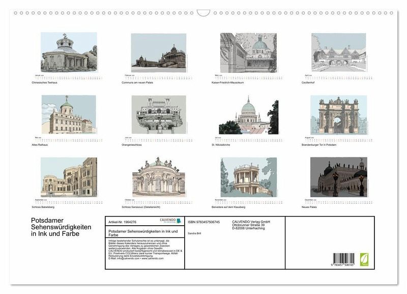 QUALITÄT - Hochwertiger Fotokalender mit 12 wunderschönen Motiven auf lichtbeständigem Bilderdruckpapier, robuste Spiralbindung mit Aufhängebügel.NACHHALTIG - deutliche Abfallreduzierung durch bedarfsgerechte Einzelstückfertigung, umweltfreundliches FSC-zertifiziertes Papier, Produktion in Deutschland, klimabewusste Logistik.PERFEKTES GESCHENK - Kalender für Freunde und Familie, für Kinder und Erwachsene, jung und alt, zu Weihnachten, Geburtstag oder zwischendurch.VIELFALT - Bildkalender in verschiedenen Formaten, z.B. DIN A5, DIN A4, DIN A3 sowie DIN A2. Ob Naturmotiv, Gemälde oder Fotos, ideal für ein persönliches Wohlfühlambiente.Handgefertigte Illustrationen von Potsdamer Sehenswürdikeiten digital coloriert. von Autor(in): Sandra Brill