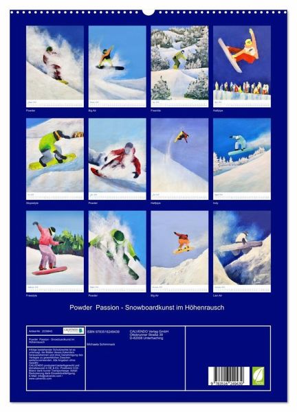 PREMIUM-LINIE - Brillanter Fotokalender mit 12 wunderschönen Motiven, Kunstdruck in Hochglanz in Museumsqualität.QUALITÄT - edle Materialien, stabile Rückwand mit 2 innovativen Einstecktaschen für eine optimale Präsentation an der Wand.NACHHALTIG - deutliche Abfallreduzierung durch bedarfsgerechte Einzelstückfertigung, umweltfreundliches FSC-zertifiziertes Papier, Produktion in Deutschland, klimabewusste Logistik.PERFEKTES GESCHENK - Kalender für Freunde und Familie, für Kinder und Erwachsene, jung und alt, zu Weihnachten, Geburtstag oder zwischendurch.Gemalte Bilder vom Snowboarden. von Autor(in): Michaela Spreider