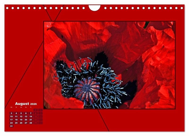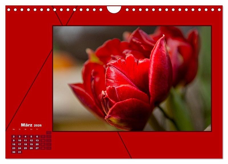 Rot ist eine der auffälligsten Farben. Dekorieren Sie mit diesem ausdrucksstarken Farbton Ihre Räumlichkeiten oder machen Sie jemanden damit eine besondere Freude. Der Kalender ist so gestaltet, dass man nach Ablauf des Jahres, hervorragend die Bilder ausschneiden und weiter nutzen kann. Goethe äußerte sich: "Die vollendetest Farbe ist das roth.
