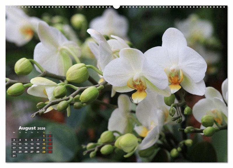 Zarte, exotische Blüten mit einer unglaublichen Vielfalt an Formen, Mustern und Farben versammeln sich in diesem wunderbaren Kalender. Bewundern Sie die beliebte Schmetterlingsorchidee (Phalaenopsis), Frauenschuhorchideen (Paphiopedilum), Cattleya, Vanda und Kahnorchidee (Cymbidium).