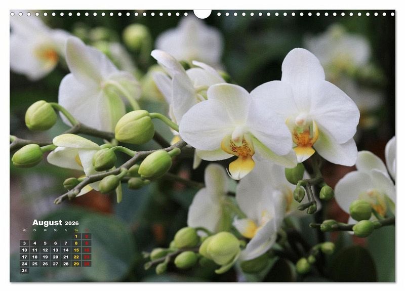 Zarte, exotische Blüten mit einer unglaublichen Vielfalt an Formen, Mustern und Farben versammeln sich in diesem wunderbaren Kalender. Bewundern Sie die beliebte Schmetterlingsorchidee (Phalaenopsis), Frauenschuhorchideen (Paphiopedilum), Cattleya, Vanda und Kahnorchidee (Cymbidium).