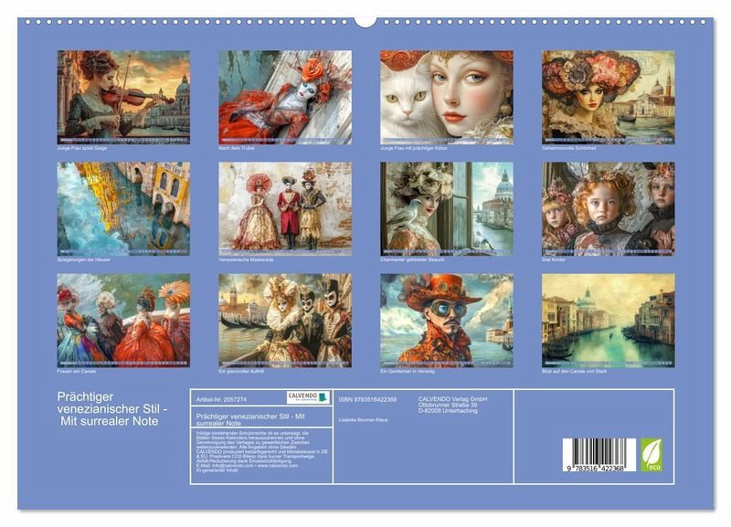 Lass dich von unseren KI-generierten Kunstwerken verzaubern, die die magische Atmosphäre Venedigs mit einem Hauch von Surrealismus verbinden. Jedes Werk erzählt eine eigene Geschichte: Eine festlich gekleidete Frau mit ihrer Katze, geheimnisvolle Maskenträger, oder eine Geigerin, die mit ihrem melodischen Spiel den atemberaubenden Ausblick auf den glitzernden Canale in Venedig untermalt. Diese Sammlung ist ein Fest für die Sinne und ein wahrer Genuss für alle Sehnsuchtsfreunde des venezianischen Stils. Die lebendigen Farben und traumhaften Szenen laden dich ein, in eine Welt voller Eleganz und Fantasie einzutauchen. Erlebe die Faszination Venedigs neu und lasse dich von der surrealen Schönheit dieser Kunstwerke inspirieren!