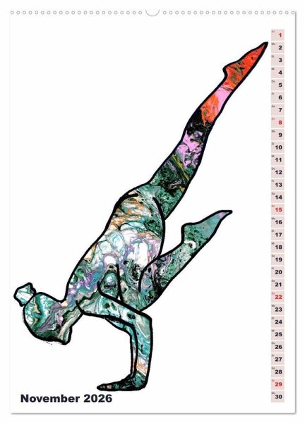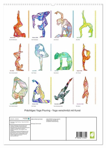 Der Kalender präsentiert ästhetische Yoga Asanas, die künstlerisch mit farbenprächtigen Pouring, einer Technik der abstrakten Acrylmalerei, gefüllt sind. So verschmelzen zwei unterschiedliche Disziplinen zu einer wunderschönen Mischung. In dem prächtigen Zusammenspiel von Farbe und Form steigern Yoga und Kunst ihren kraftvollen Ausdruck.