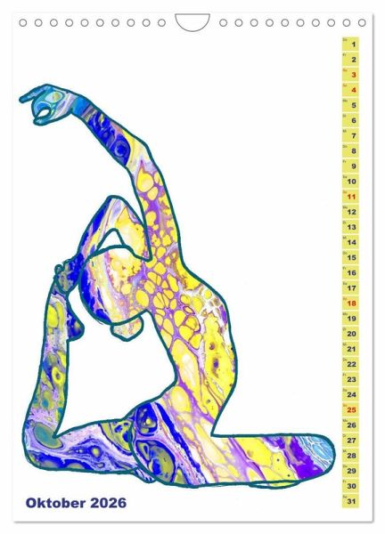 Der Kalender präsentiert ästhetische Yoga Asanas, die künstlerisch mit farbenprächtigen Pouring, einer Technik der abstrakten Acrylmalerei, gefüllt sind. So verschmelzen zwei unterschiedliche Disziplinen zu einer wunderschönen Mischung. In dem prächtigen Zusammenspiel von Farbe und Form steigern Yoga und Kunst ihren kraftvollen Ausdruck.