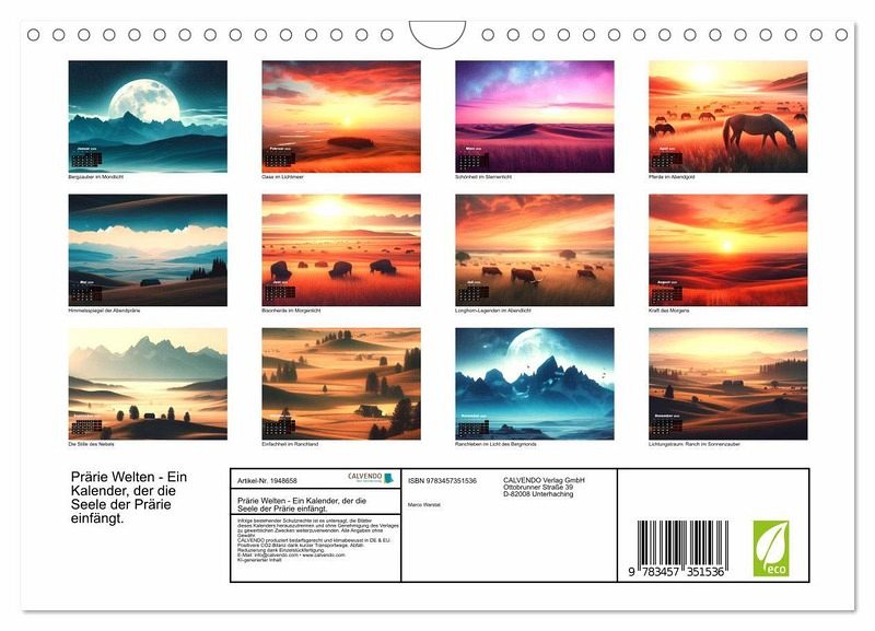 QUALITÄT - Hochwertiger Fotokalender mit 12 wunderschönen Motiven auf lichtbeständigem Bilderdruckpapier, robuste Spiralbindung mit Aufhängebügel.NACHHALTIG - deutliche Abfallreduzierung durch bedarfsgerechte Einzelstückfertigung, umweltfreundliches FSC-zertifiziertes Papier, Produktion in Deutschland, klimabewusste Logistik.PERFEKTES GESCHENK - Kalender für Freunde und Familie, für Kinder und Erwachsene, jung und alt, zu Weihnachten, Geburtstag oder zwischendurch.VIELFALT - Bildkalender in verschiedenen Formaten, z.B. DIN A5, DIN A4, DIN A3 sowie DIN A2. Ob Naturmotiv, Gemälde oder Fotos, ideal für ein persönliches Wohlfühlambiente.Prärie Welten: Seele der Wildnis im Kalender. von Autor(in): Marco Warstat