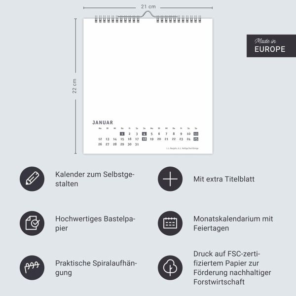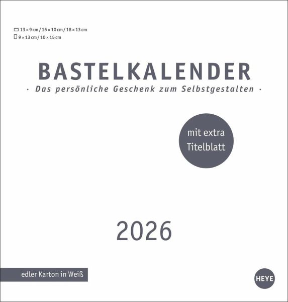 - Von schönen Sprüchen bis zu lustigen Schnappschüssen: in diesem Foto- und Bastelkalender 2026 können Sie Ihre ganze Kreativität ausleben- Der Wandkalender zum Selbstgestalten im Format 21 x 22 cm mit extra Titelblatt: Ausreichend Platz für tolle Erinnerungen- Verschönern Sie Ihren DIY-Kalender mit Kunstwerken aus eigener Produktion: Dank weißer Grundfarbe ein Leichtes- Gemeinsam oder allein basteln und dann verschenken: Der Kalender 2026 wird auf jeden Fall ein Hingucker und ein großartiges Geschenk für Ihre Liebsten- Kalender, so einzigartig wie Sie selbst: Die Blanko-Kalender von Heye im Athesia Kalenderverlag gibt es in vielen Farben und Größen