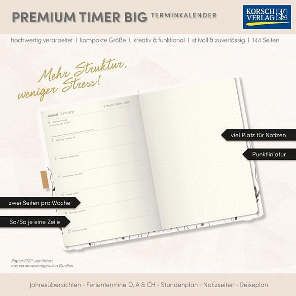 Das Auge plant mit - bei diesem hochwertig ausgestatteten Premium-Timer. Mit geprägtem und mit Kaltfolie veredeltem Umschlag, Stifthalter und Leseband sowie praktischer Zetteltasche. Auf jeder Doppelseite des 12-Monats-Kalendariums findet man die Wochenübersicht sowie eine Seite für Notizen.