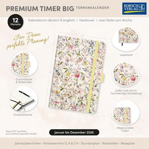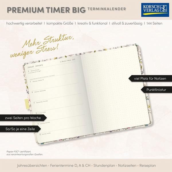 Das Auge plant mit bei diesem hochwertig ausgestatteten Premium-Timer. Mit geprägtem und mit Kaltfolie veredeltem Umschlag, Stifthalter und Leseband sowie praktischer Zetteltasche. Auf jeder Doppelseite des 12-Monats-Kalendariums findet man die Wochenübersicht sowie eine Seite für Notizen.