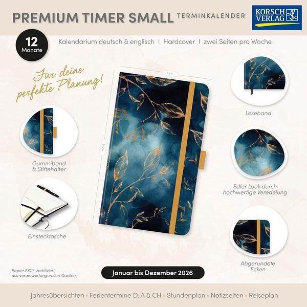 Taschenkalender im Format: 9 x 14 cm, 144 Seiten, umweltfreundliches FSC PapierJede Doppelseite des 12 Monats-Kalendariums zeigt die Wochenübersicht sowie eine Seite für NotizenKalendarium auf Deutsch und Englisch; Feiertagen für Deutschland, Österreich und SchweizGeprägter und mit Kaltfolie veredelter UmschlagStifthalter und Lesebändchen sowie praktische Zetteltasche; Anzeige der Mondphasen