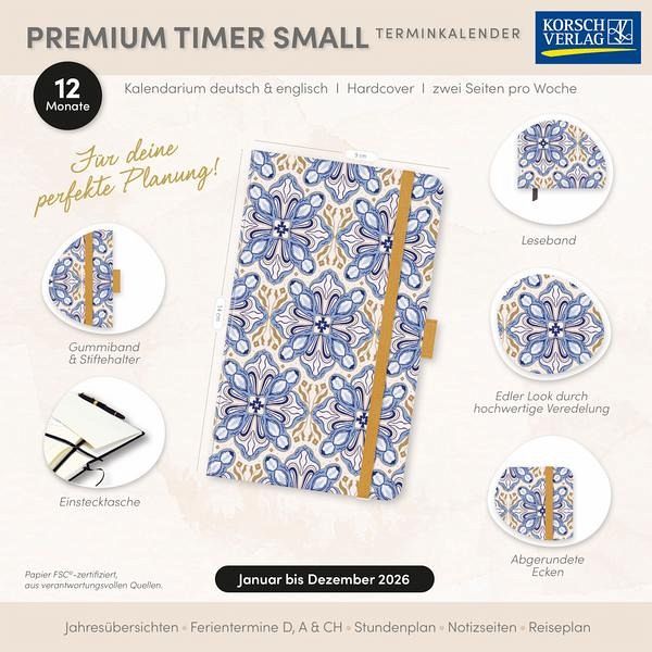 Taschenkalender im Format: 9 x 14 cm, 144 Seiten, umweltfreundliches FSC PapierJede Doppelseite des 12 Monats-Kalendariums zeigt die Wochenübersicht sowie eine Seite für NotizenKalendarium auf Deutsch und Englisch; Feiertagen für Deutschland, Österreich und SchweizGeprägter und mit Kaltfolie veredelter UmschlagStifthalter und Lesebändchen sowie praktische Zetteltasche; Anzeige der Mondphasen