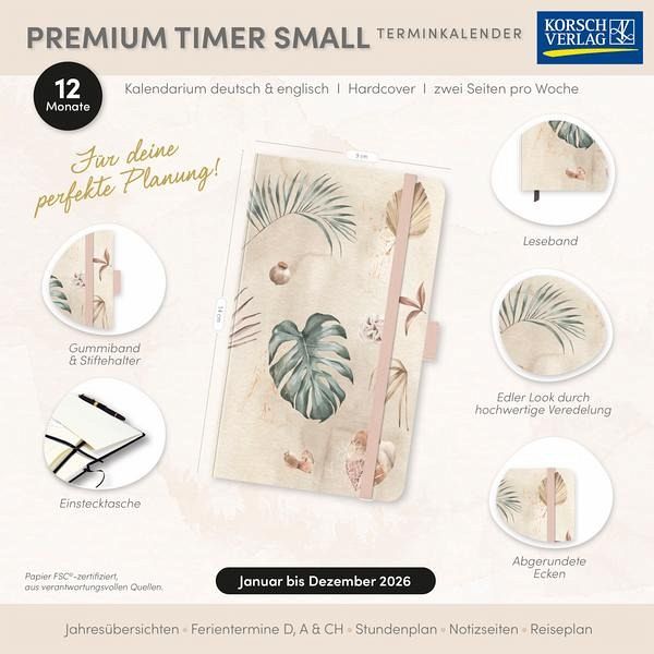 Taschenkalender im Format: 9 x 14 cm, 144 Seiten, umweltfreundliches FSC PapierJede Doppelseite des 12 Monats-Kalendariums zeigt die Wochenübersicht sowie eine Seite für NotizenKalendarium auf Deutsch und Englisch; Feiertagen für Deutschland, Österreich und SchweizGeprägter und mit Kaltfolie veredelter UmschlagStifthalter und Lesebändchen sowie praktische Zetteltasche; Anzeige der Mondphasen