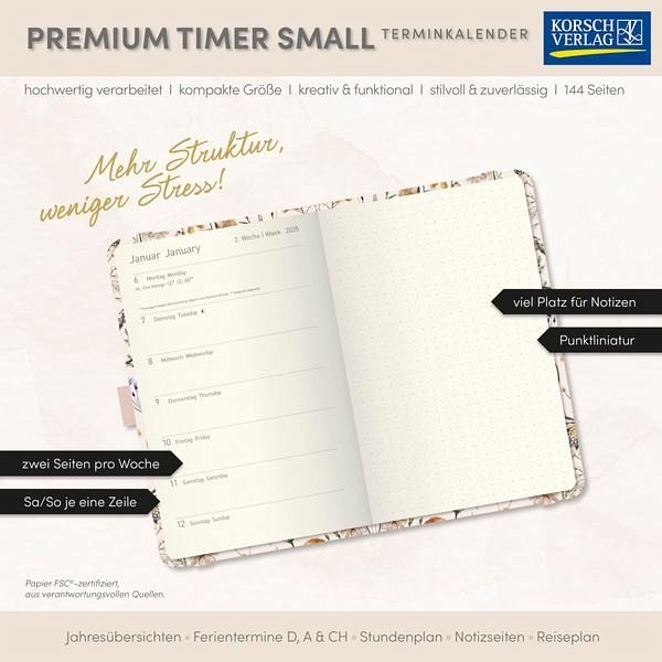 Taschenkalender im Format: 9 x 14 cm, 144 Seiten, umweltfreundliches FSC PapierJede Doppelseite des 12 Monats-Kalendariums zeigt die Wochenübersicht sowie eine Seite für NotizenKalendarium auf Deutsch und Englisch; Feiertagen für Deutschland, Österreich und SchweizGeprägter und mit Kaltfolie veredelter UmschlagStifthalter und Lesebändchen sowie praktische Zetteltasche; Anzeige der Mondphasen