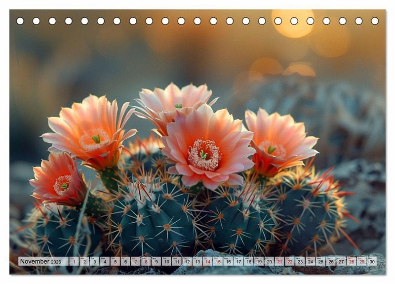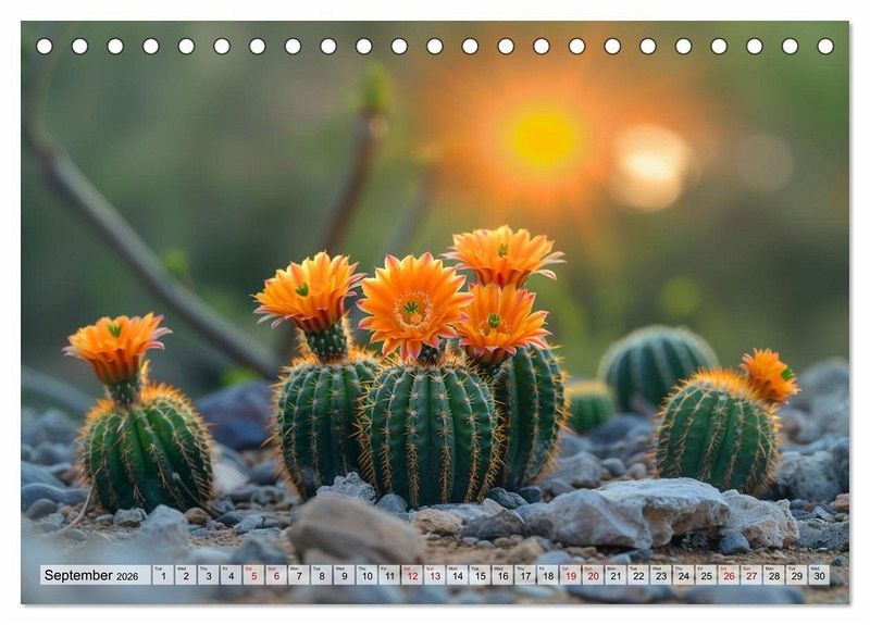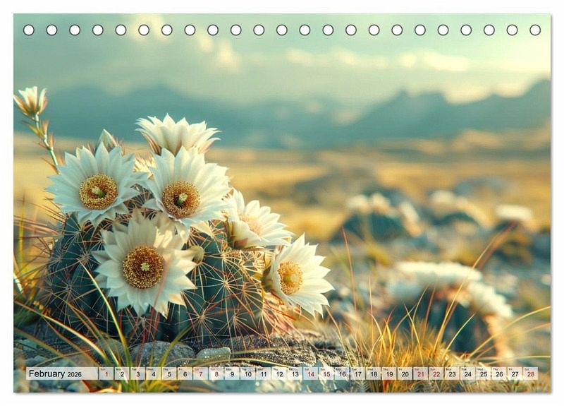 Welcome to the blooming world of cacti. Experience the wonders of desert flora with AI-generated images showing most cacti in full bloom. Each month reveals a new splendor of bright blooms in different colors and shapes that shine in the wild landscape. From rich reds and oranges to delicate pinks and yellows, experience the variety of cacti in bloom.