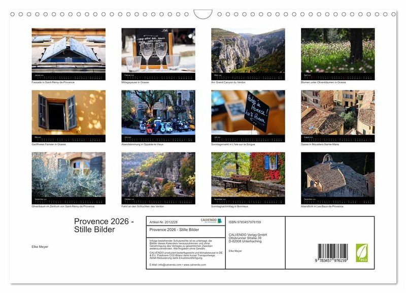 QUALITÄT - Hochwertiger Fotokalender mit 12 wunderschönen Motiven auf lichtbeständigem Bilderdruckpapier, robuste Spiralbindung mit Aufhängebügel.NACHHALTIG - deutliche Abfallreduzierung durch bedarfsgerechte Einzelstückfertigung, umweltfreundliches FSC-zertifiziertes Papier, Produktion in Deutschland, klimabewusste Logistik.PERFEKTES GESCHENK - Kalender für Freunde und Familie, für Kinder und Erwachsene, jung und alt, zu Weihnachten, Geburtstag oder zwischendurch.VIELFALT - Bildkalender in verschiedenen Formaten, z.B. DIN A5, DIN A4, DIN A3 sowie DIN A2. Ob Naturmotiv, Gemälde oder Fotos, ideal für ein persönliches Wohlfühlambiente.Ein Streifzug durch Orte der Provence von Autor(in): Elke Meyer