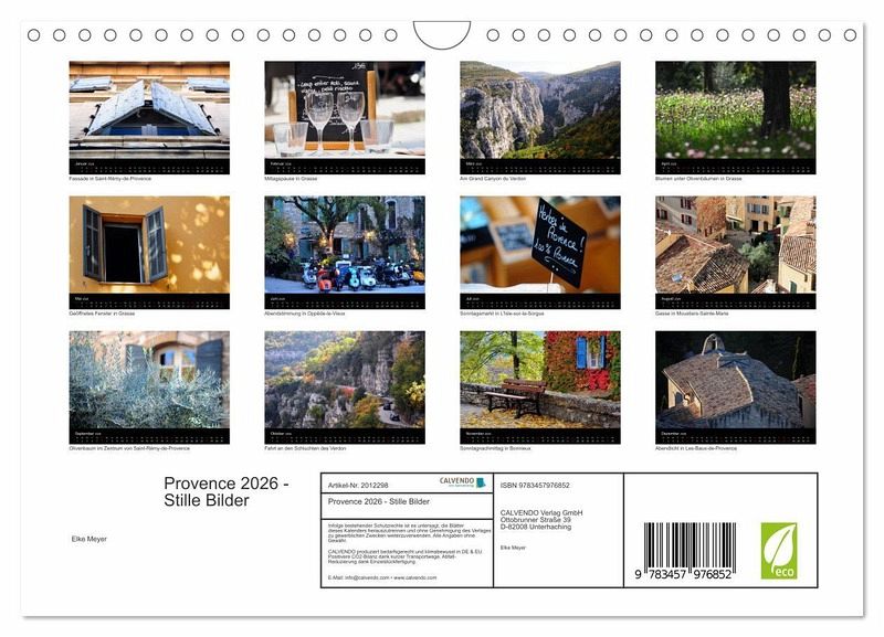 QUALITÄT - Hochwertiger Fotokalender mit 12 wunderschönen Motiven auf lichtbeständigem Bilderdruckpapier, robuste Spiralbindung mit Aufhängebügel.NACHHALTIG - deutliche Abfallreduzierung durch bedarfsgerechte Einzelstückfertigung, umweltfreundliches FSC-zertifiziertes Papier, Produktion in Deutschland, klimabewusste Logistik.PERFEKTES GESCHENK - Kalender für Freunde und Familie, für Kinder und Erwachsene, jung und alt, zu Weihnachten, Geburtstag oder zwischendurch.VIELFALT - Bildkalender in verschiedenen Formaten, z.B. DIN A5, DIN A4, DIN A3 sowie DIN A2. Ob Naturmotiv, Gemälde oder Fotos, ideal für ein persönliches Wohlfühlambiente.Ein Streifzug durch Orte der Provence von Autor(in): Elke Meyer