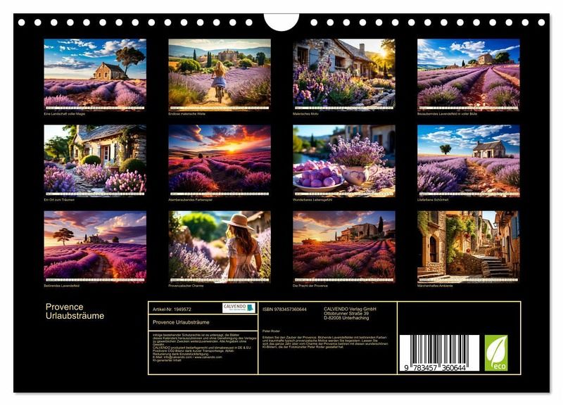 QUALITÄT - Hochwertiger Fotokalender mit 12 wunderschönen Motiven auf lichtbeständigem Bilderdruckpapier, robuste Spiralbindung mit Aufhängebügel.NACHHALTIG - deutliche Abfallreduzierung durch bedarfsgerechte Einzelstückfertigung, umweltfreundliches FSC-zertifiziertes Papier, Produktion in Deutschland, klimabewusste Logistik.PERFEKTES GESCHENK - Kalender für Freunde und Familie, für Kinder und Erwachsene, jung und alt, zu Weihnachten, Geburtstag oder zwischendurch.VIELFALT - Bildkalender in verschiedenen Formaten, z.B. DIN A5, DIN A4, DIN A3 sowie DIN A2. Ob Naturmotiv, Gemälde oder Fotos, ideal für ein persönliches Wohlfühlambiente.Zauber und Charme der Provence. von Autor(in): Peter Roder