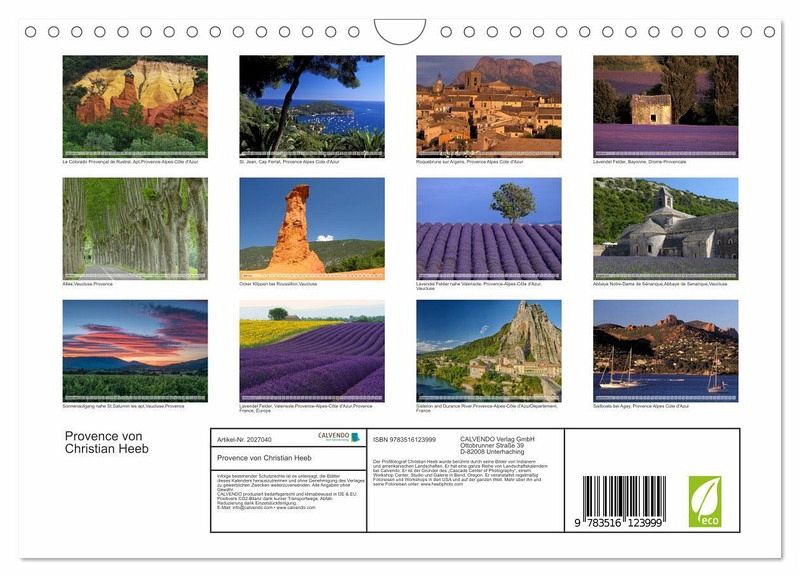 QUALITÄT - Hochwertiger Fotokalender mit 12 wunderschönen Motiven auf lichtbeständigem Bilderdruckpapier, robuste Spiralbindung mit Aufhängebügel.NACHHALTIG - deutliche Abfallreduzierung durch bedarfsgerechte Einzelstückfertigung, umweltfreundliches FSC-zertifiziertes Papier, Produktion in Deutschland, klimabewusste Logistik.PERFEKTES GESCHENK - Kalender für Freunde und Familie, für Kinder und Erwachsene, jung und alt, zu Weihnachten, Geburtstag oder zwischendurch.VIELFALT - Bildkalender in verschiedenen Formaten, z.B. DIN A5, DIN A4, DIN A3 sowie DIN A2. Ob Naturmotiv, Gemälde oder Fotos, ideal für ein persönliches Wohlfühlambiente.Beeindruckende Landschafts Fotografien von der Provence in Frankreich von Christian Heeb von Autor(in): Christian Heeb