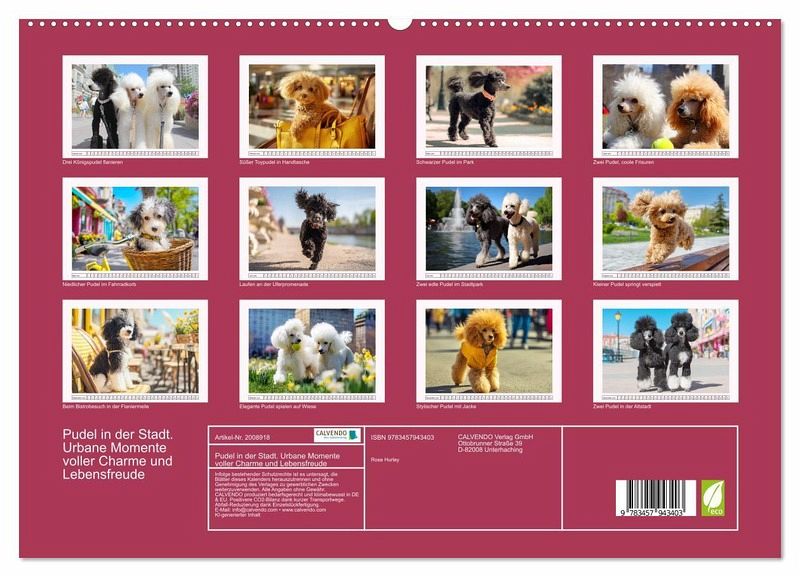 Dieser Kalender zeigt stilvolle, niedliche und extravagante Pudel in urbanen Kulissen. Die Bilder erzählen vom entspannten und aktiven Leben der Hunde inmitten der Stadt. Ob beim Bummeln, Spielen oder Kaffeetrinken - die Pudel bezaubern mit ihrer Eleganz und Lebensfreude. Alle Bilder wurden mit der Hilfe von KI erstellt und sind perfekt für alle Hundefreunde, die zauberhafte Pudel und das Leben in der Stadt lieben.