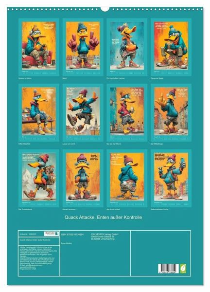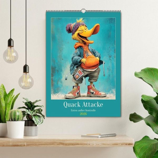 "Quack Attacken" zeigt Enten, die den Großstadtalltag mit zu viel Selbstvertrauen und einer Prise Chaos meistern - oder zumindest so tun. Alle Illustrationen wurden mit der Hilfe von KI erstellt und porträtieren sie im heruntergekommenen Streetwear-Stil, irgendwo zwischen Wasservogel und Straßenlegende. Mit frechen Sprüchen, müden Blicken und auffällig viel Energie bringen sie Ironie in jede Szene. Ein Kalender für alle, die Enten, Humor und Stadtleben cool finden.