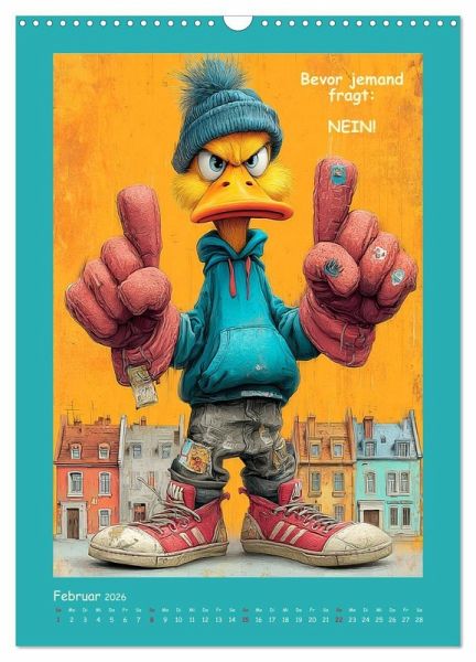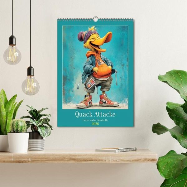 "Quack Attacken" zeigt Enten, die den Großstadtalltag mit zu viel Selbstvertrauen und einer Prise Chaos meistern - oder zumindest so tun. Alle Illustrationen wurden mit der Hilfe von KI erstellt und porträtieren sie im heruntergekommenen Streetwear-Stil, irgendwo zwischen Wasservogel und Straßenlegende. Mit frechen Sprüchen, müden Blicken und auffällig viel Energie bringen sie Ironie in jede Szene. Ein Kalender für alle, die Enten, Humor und Stadtleben cool finden.