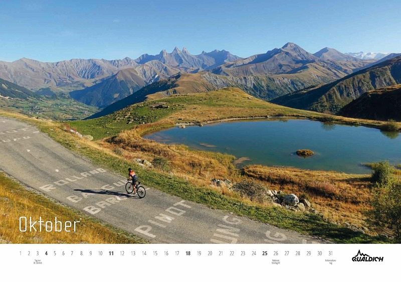 Auf 12 Monatsblättern und dem Titelblatt finden sich 13 herausragende Bilder, beigesteuert von den Mitgliedern des Pässe-Portals quaeldich.de, und ausgewählt von der quaeldich.de-Redaktion unter strengen Qualitätskriterien. Panoramen, Auf- und Abfahrten, Frühling, Sommer, Herbst und Winter - der Kalender zeigt das Radfahren von der schönsten Seite und in unterschiedlichsten Regionen. Die Monatsblätter enthalten neben dem Bild ein übersichtliches Kalendarium (inkl Feiertagen). Jedes Kalenderbild wird auf der Rückseite von einem ausführlichen Tourentipp inklusive Beschreibung, Bildern, Höhenprofil und Übersichtskarte ergänzt.