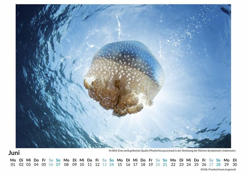 Tauchen Sie ein in die faszinierende Welt der Quallen! Dieser hochwertige Wandkalender präsentiert Ihnen 12 atemberaubende Motive, die die geheimnisvolle Schönheit dieser Meeresbewohner perfekt einfangen. Gedruckt auf lichtbeständigem Bilderdruckpapier, kommen die leuchtenden Farben und filigranen Formen der Quallen besonders gut zur Geltung. Jeder Monat wird so zu einem visuellen Highlight in Ihrem Zuhause oder Büro. Nachhaltig in Deutschland auf FSC-zertifiziertem Papier produziert, vereint dieser Kalender Ästhetik und Umweltbewusstsein. Gönnen Sie sich oder Ihren Liebsten ein Stück Ozean für die Wand - ein echter Blickfang für jeden Raum! Hochwertig Erleben Sie ein Jahr voller Eleganz mit unserem Premium-Fotokalender. Jedes der 12 Motive ist auf hochwertigem, lichtbeständigem Bilderdruckpapier gedruckt, um die Lebendigkeit jedes Bildes zu bewahren. Die robuste Spiralbindung gewährleistet Langlebigkeit und einfache Handhabung. Nachhaltig Unser Engagement für die Umwelt spiegelt sich in jedem Exemplar wider. Durch die Produktion auf Abruf reduzieren wir signifikant unseren Abfall. Wir verwenden ausschließlich umweltfreundliches, FSC-zertifiziertes Papier. Stolz gefertigt in Deutschland, achten wir bei unserer Logistik auf Klimaschutz, um unseren ökologischen Fußabdruck zu minimieren. Das ideale Geschenk Dieser Kalender ist das perfekte Präsent für jeden Anlass - ob Weihnachten, Geburtstage oder einfach als liebevolle Aufmerksamkeit zwischendurch. Geeignet für Freunde, Familie, Kinder und Erwachsene gleichermaßen, bereichert er jedes Zuhause mit seiner Vielfalt und Schönheit, unabhängig vom Alter der Beschenkten.