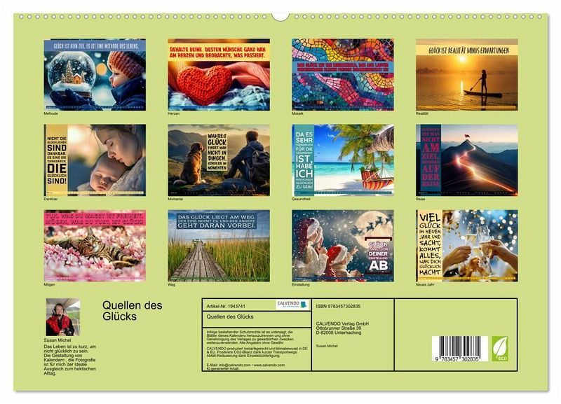 PREMIUM-LINIE - Brillanter Fotokalender mit 12 wunderschönen Motiven, Kunstdruck in Hochglanz in Museumsqualität.QUALITÄT - edle Materialien, stabile Rückwand mit 2 innovativen Einstecktaschen für eine optimale Präsentation an der Wand.NACHHALTIG - deutliche Abfallreduzierung durch bedarfsgerechte Einzelstückfertigung, umweltfreundliches FSC-zertifiziertes Papier, Produktion in Deutschland, klimabewusste Logistik.PERFEKTES GESCHENK - Kalender für Freunde und Familie, für Kinder und Erwachsene, jung und alt, zu Weihnachten, Geburtstag oder zwischendurch.Wo Freude entspringt von Autor(in): Susan Michel