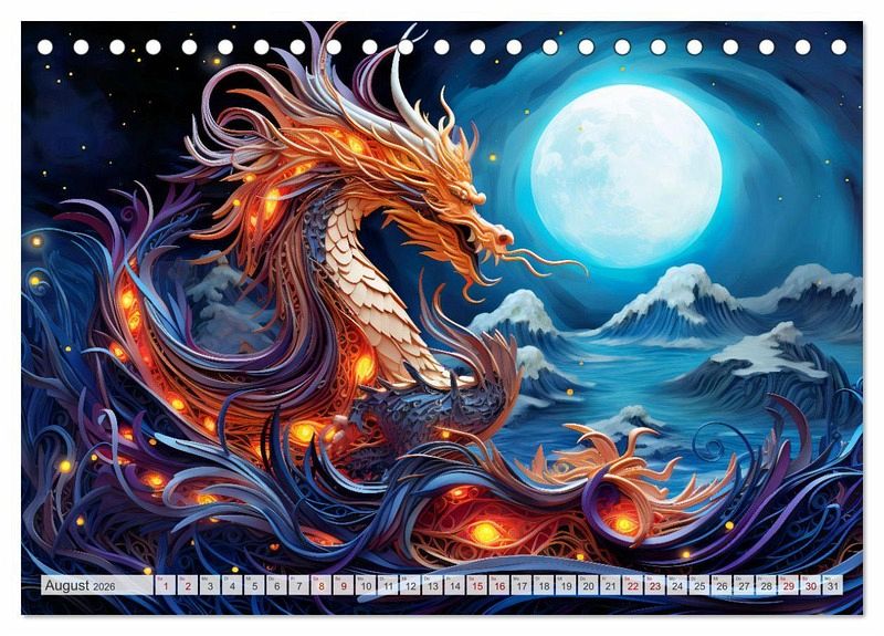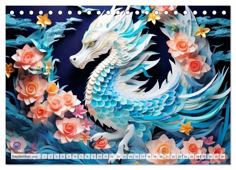 Entdecken Sie die faszinierende Welt des "Quilling-Drachen - Jahr des Drachen" Kalenders. Jeder Monat enthüllt meisterhaft gestaltete, KI-gefertigte Drachen in Anlehnung an das Chinesische Tierkreiszeichen. Mit kunstvollen Details, die durch die antike Kunst des Quilling-Papiers zum Leben erweckt werden, vereint dieser Kalender Tradition, Eleganz und künstlerische Raffinesse. "Quilling" ist eine kreative Technik des Papierbastelns, bei der schmale Papierstreifen gerollt, geformt und anschließend zu verschiedenen Designs zusammengesetzt werden.