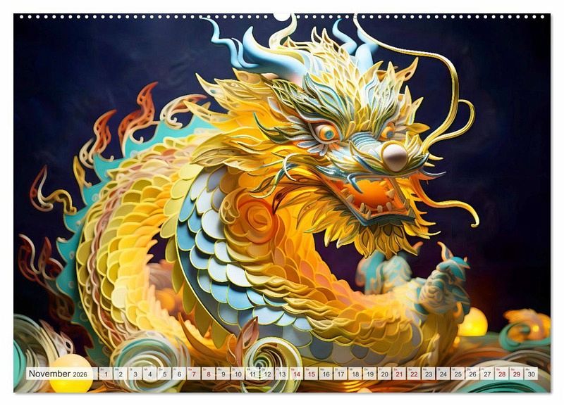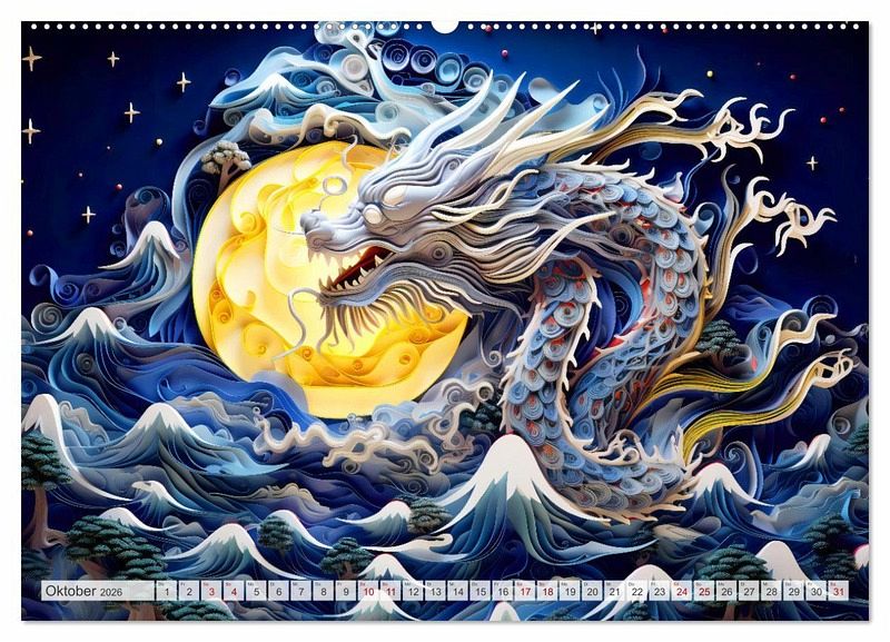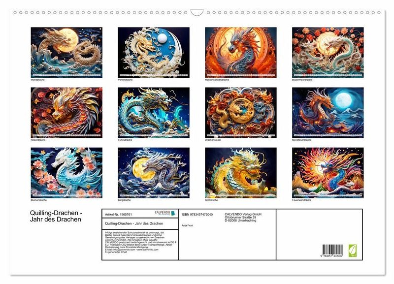 Entdecken Sie die faszinierende Welt des "Quilling-Drachen - Jahr des Drachen" Kalenders. Jeder Monat enthüllt meisterhaft gestaltete, KI-gefertigte Drachen in Anlehnung an das Chinesische Tierkreiszeichen. Mit kunstvollen Details, die durch die antike Kunst des Quilling-Papiers zum Leben erweckt werden, vereint dieser Kalender Tradition, Eleganz und künstlerische Raffinesse. "Quilling" ist eine kreative Technik des Papierbastelns, bei der schmale Papierstreifen gerollt, geformt und anschließend zu verschiedenen Designs zusammengesetzt werden.