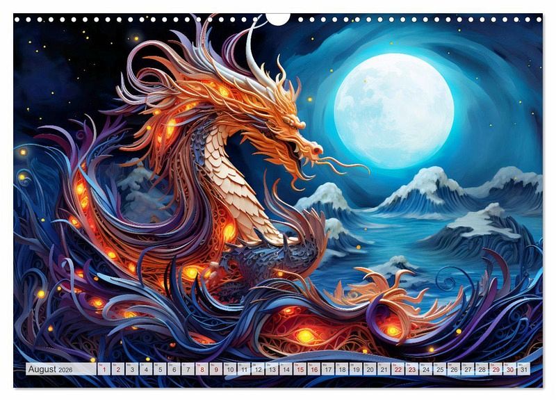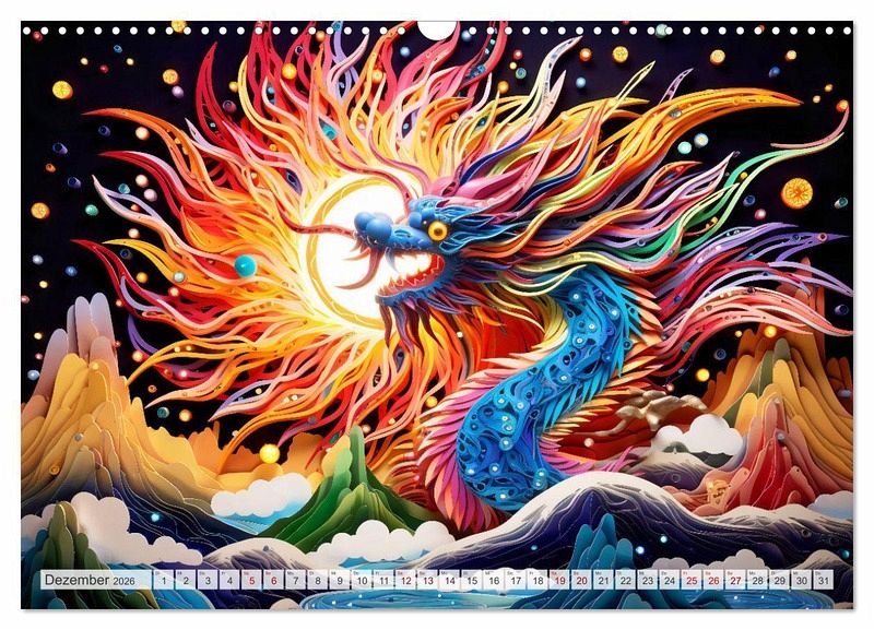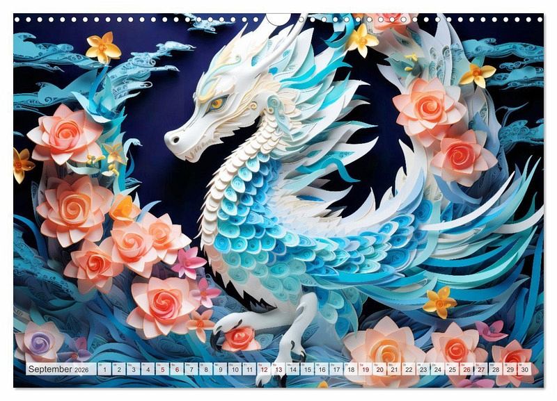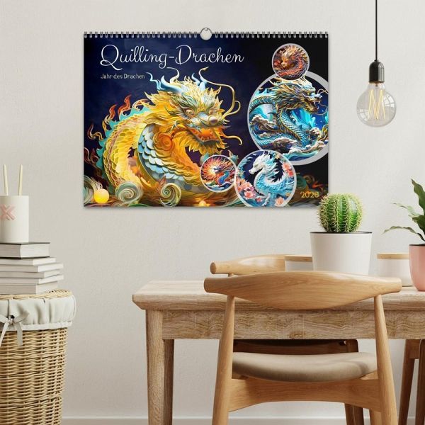Entdecken Sie die faszinierende Welt des "Quilling-Drachen - Jahr des Drachen" Kalenders. Jeder Monat enthüllt meisterhaft gestaltete, KI-gefertigte Drachen in Anlehnung an das Chinesische Tierkreiszeichen. Mit kunstvollen Details, die durch die antike Kunst des Quilling-Papiers zum Leben erweckt werden, vereint dieser Kalender Tradition, Eleganz und künstlerische Raffinesse. "Quilling" ist eine kreative Technik des Papierbastelns, bei der schmale Papierstreifen gerollt, geformt und anschließend zu verschiedenen Designs zusammengesetzt werden.