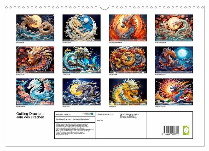 QUALITÄT - Hochwertiger Fotokalender mit 12 wunderschönen Motiven auf lichtbeständigem Bilderdruckpapier, robuste Spiralbindung mit Aufhängebügel.NACHHALTIG - deutliche Abfallreduzierung durch bedarfsgerechte Einzelstückfertigung, umweltfreundliches FSC-zertifiziertes Papier, Produktion in Deutschland, klimabewusste Logistik.PERFEKTES GESCHENK - Kalender für Freunde und Familie, für Kinder und Erwachsene, jung und alt, zu Weihnachten, Geburtstag oder zwischendurch.VIELFALT - Bildkalender in verschiedenen Formaten, z.B. DIN A5, DIN A4, DIN A3 sowie DIN A2. Ob Naturmotiv, Gemälde oder Fotos, ideal für ein persönliches Wohlfühlambiente.Drachentanzzauber: Ein Quilling-Papierkalender für das Chinesische Tierkreiszeichen von Autor(in): Anja Frost