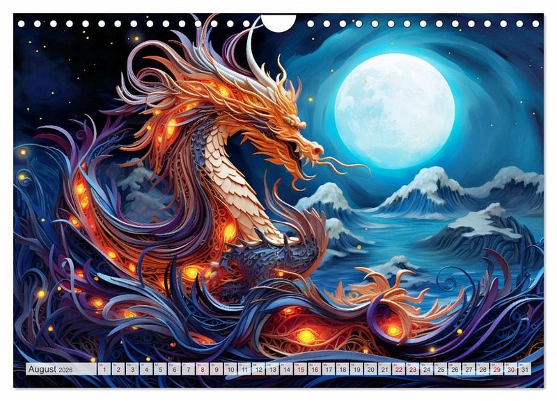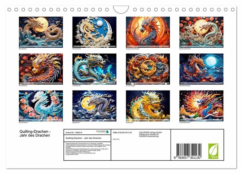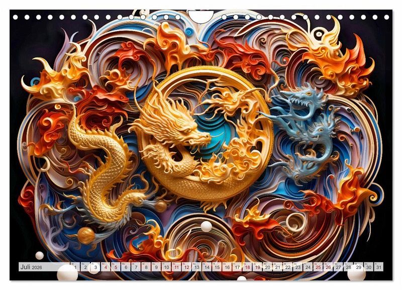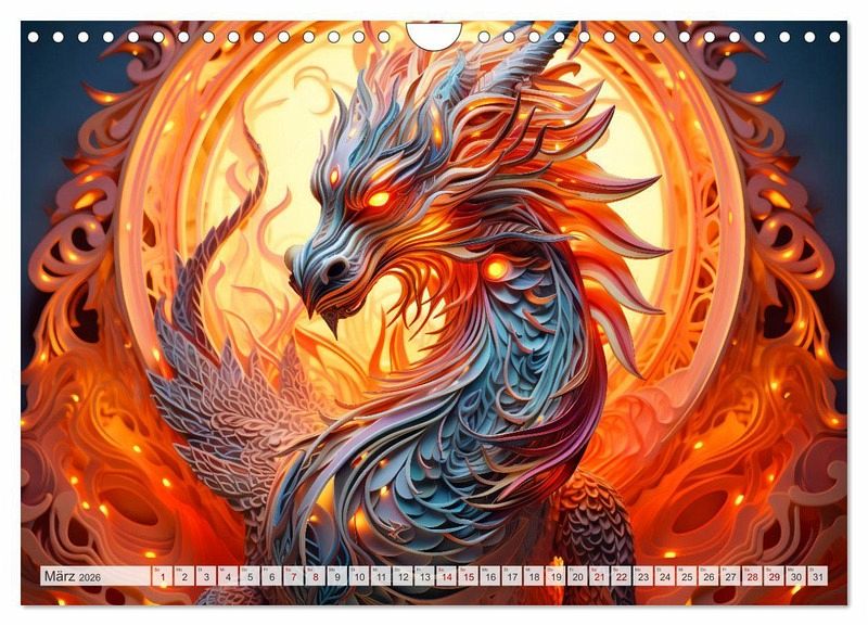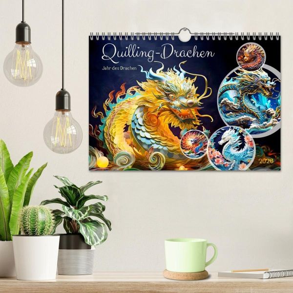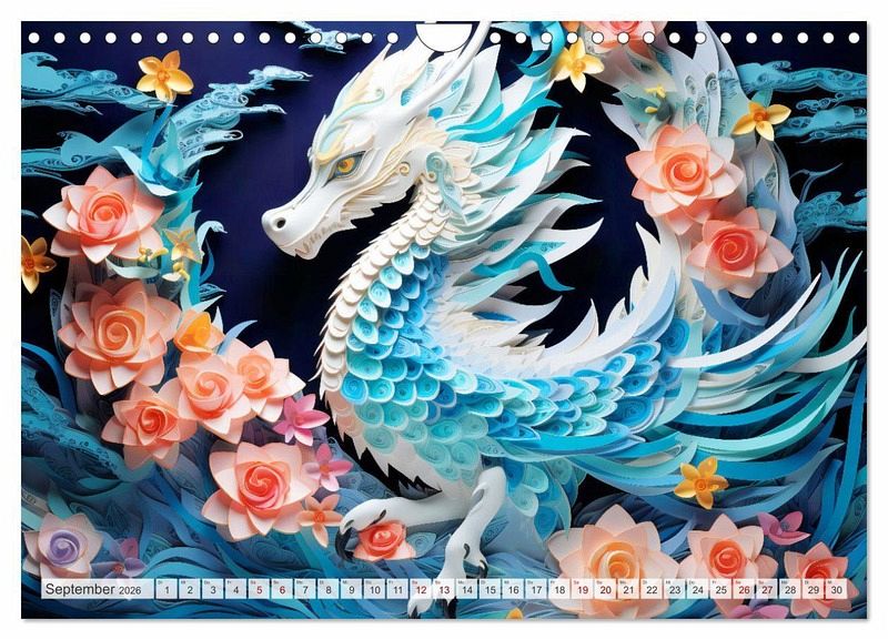 Entdecken Sie die faszinierende Welt des "Quilling-Drachen - Jahr des Drachen" Kalenders. Jeder Monat enthüllt meisterhaft gestaltete, KI-gefertigte Drachen in Anlehnung an das Chinesische Tierkreiszeichen. Mit kunstvollen Details, die durch die antike Kunst des Quilling-Papiers zum Leben erweckt werden, vereint dieser Kalender Tradition, Eleganz und künstlerische Raffinesse. "Quilling" ist eine kreative Technik des Papierbastelns, bei der schmale Papierstreifen gerollt, geformt und anschließend zu verschiedenen Designs zusammengesetzt werden.