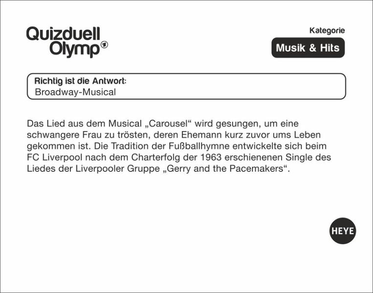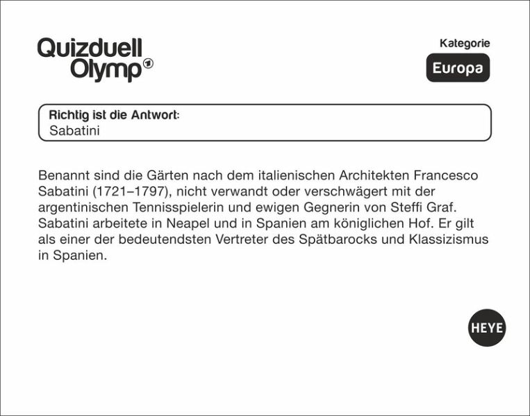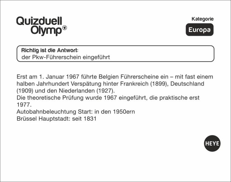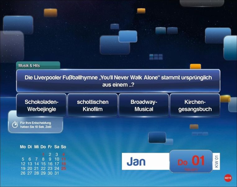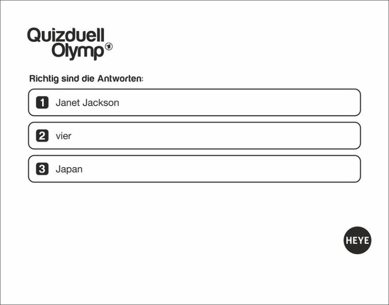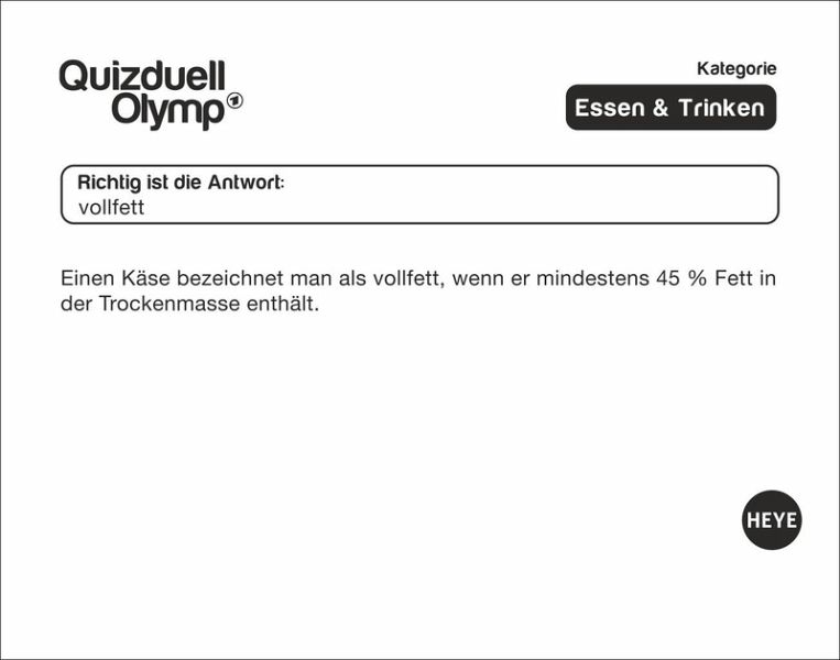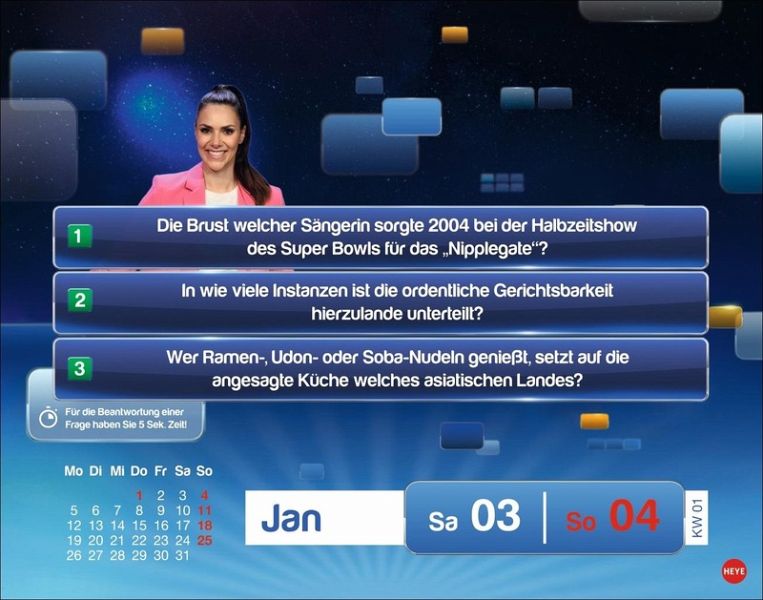 - Multiple Choice oder offene Fragen: Der Abreißkalender zur ersten interaktiven Fernseh-Quizshow der Welt ist da!- Täglich die grauen Zellen trainieren mit Kalender-Rätsel aus dem Aufstellkalender 2026- Werden Sie zum Quiz-Profi: Beantworten Sie wie beim Olymp Quizduell im Ersten die Fragen und stellen Sie Ihr Wissen unter Beweis- Der Kalender für jeden Tag: Perfekt für erfahrene Rätselfüchse und alle, die es werden wollen- Quizkalender für Erwachsene: Mit den Kalendern von Heye im Athesia Kalenderverlag werden Sie Quiz-Profi!- Jeder Wochentag ein Kalenderblatt, Samstag/Sonntag auf einem Blatt.