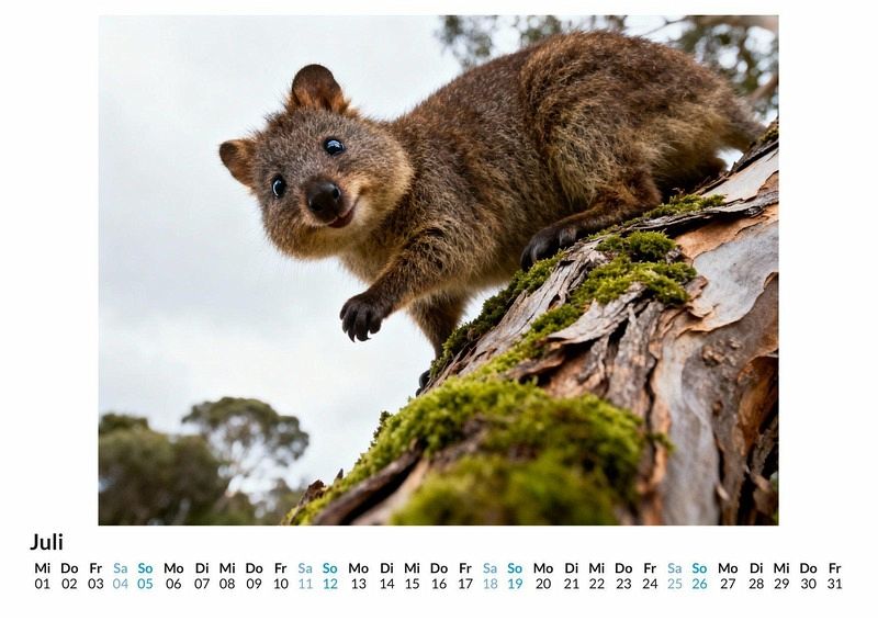 Ein Lächeln, das ansteckt und jeden Raum erhellt. Die Quokkas, bekannt als die glücklichsten Tiere der Welt, sind die Stars dieses Kalenders. Ihre unbeschwerte Art und ihr permanentes Grinsen machen sie zu perfekten Begleitern durch das Jahr. Der Wandkalender "Quokka" fängt ihre fröhliche Natur in zwölf einzigartigen Momenten ein. Dieser Kalender ist eine gute Wahl: Für alle, die eine tägliche Dosis Fröhlichkeit in ihrem Alltag schätzen. Für Liebhaber von Tierfotografie und ungewöhnlichen Tiermotiven. Als Geschenk, das ein ganzes Jahr lang Freude bereitet. Jeder Monat präsentiert eine neue Szene, die den Charme dieser kleinen Beuteltiere aus Australien zeigt. Von neugierigen Blicken im dichten Grün bis hin zu entspannten Momenten in der Sonne, die Motive fangen die Essenz ihrer Lebensfreude ein. Die Bilder wurden durch das Zusammenspiel von kreativen Impulsen und komplexen Algorithmen zum Leben erweckt und zeigen die Tiere in fotorealistischer Darstellung. Jedes Bild erzählt eine kleine, heitere Geschichte. Was der Kalender bietet: Zwölf sorgfältig ausgewählte Monatsmotive der fröhlichen Quokkas. Ein übersichtliches Kalendarium für Termine und Notizen. Ein dekorativer Wandschmuck für Zuhause oder das Büro. Dieser Kalender ist mehr als nur ein Zeitplaner; er ist eine tägliche Erinnerung an die kleinen Freuden des Lebens. Ein Begleiter, der Monat für Monat ein Lächeln schenkt und den Alltag mit positiver Energie bereichert. Es lohnt sich, einen Blick auf die einzelnen Monatsblätter zu werfen und sich von der guten Laune der Quokkas anstecken zu lassen.