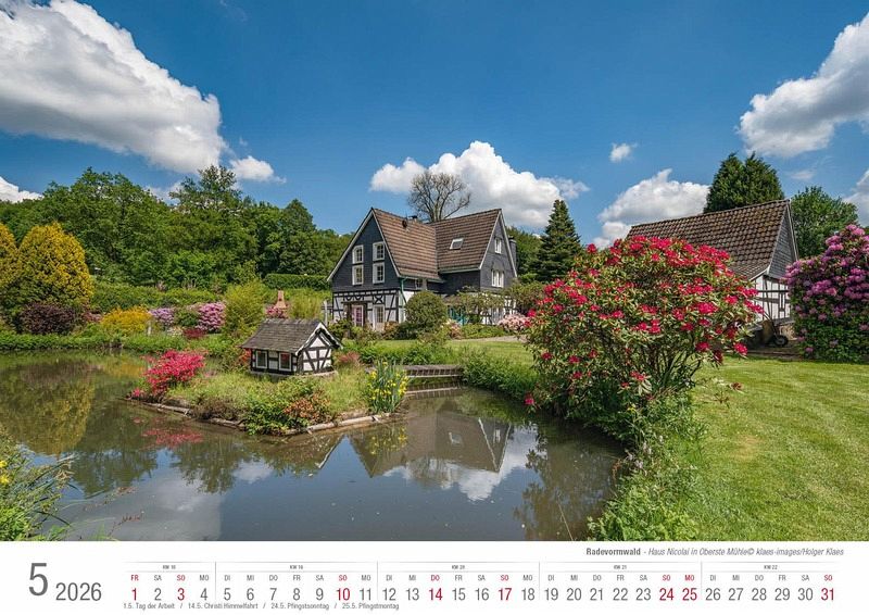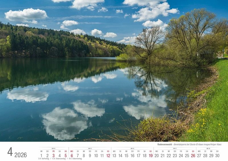 Der hochwertig verarbeitete Bildkalender Radevormwald 2026 führt mit aktuellen, stimmungsvollen und repräsentativen Aufnahmen durch die Bergische Kleinstadt. 14 Seiten, Bilderdruck matt 170 g + stabiler Graukarton aus 1 mm Buchbinderpappe als Rückwand vor dem Indexblatt. Format A3, ca. 42 x 30 cm quer, Spiralbindung.