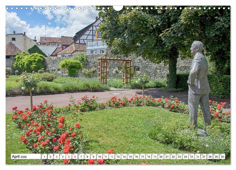 April: Stadtgartensicht mit Bronzefigur des Ehrenbürgers W.Messner von Friedhelm Zilly