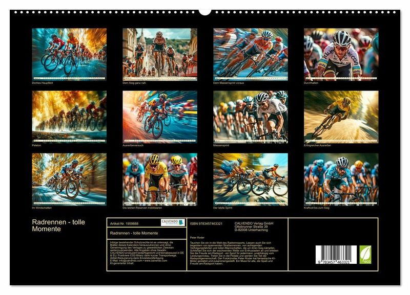 Tauchen Sie ein in die Welt des Radrennsports. Lassen auch Sie sich begeistern von spannenden Straßenrennen, von aufregenden Verfolgungsfahrten und tollen Mannschaften, die um ihren Sieg kämpfen. Schließen Sie sich der wachsenden Welle von Enthusiasten an und erleben Sie die Freude am Radsport - ein Sport für jedermann, unabhängig vom Leistungsniveau. Treten Sie in die Pedale und werden Sie Teil der Radsportgemeinschaft. Der Fotokünstler Peter Roder hat fantastische KI-Bilder gestaltet und zusammengestellt. Ein Muss für alle, die Spaß und Freude am Radsport haben.