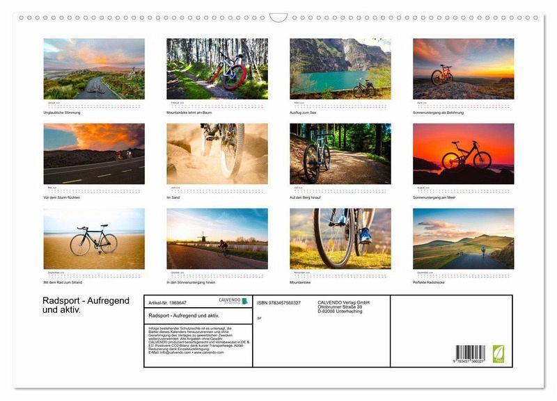 Egal ob man lieber in der Stadt oder am Land unterwegs ist, mit dem Rad gibt es so viel zu entdecken. Dieser Kalender zeigt 12 tolle Fotos von wunderschönen Radstrecken und Detailaufnahmen, da bekommen Sie Lust auf Ihr Rad zu steigen und einfach loszufahren.