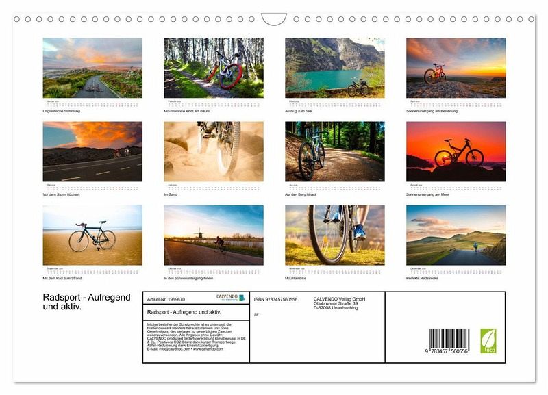 Egal ob man lieber in der Stadt oder am Land unterwegs ist, mit dem Rad gibt es so viel zu entdecken. Dieser Kalender zeigt 12 tolle Fotos von wunderschönen Radstrecken und Detailaufnahmen, da bekommen Sie Lust auf Ihr Rad zu steigen und einfach loszufahren.