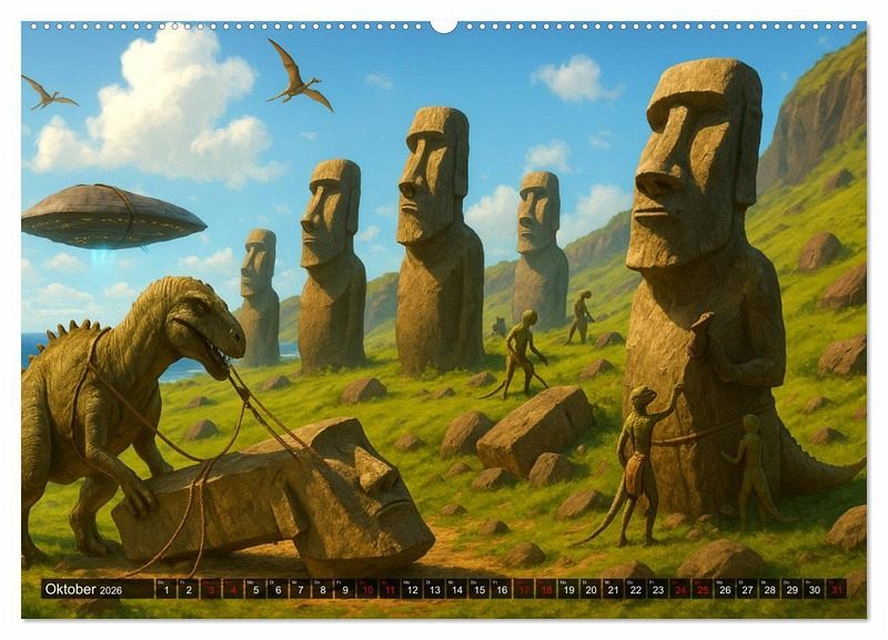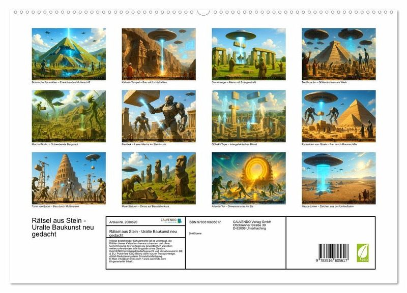 KI generierte rätselhafte Bauwerke, geheimnisvolle Spuren - dieser außergewöhnliche Kalender zeigt 14 legendäre Monumente in einer völlig neuen Perspektive. Stonehenge, die Pyramiden, die Moai und viele andere Weltwunder erscheinen hier in einer Fantasieversion: erbaut von Aliens, Dinosauriern oder Zeitreisenden! Was war, was ist Fiktion - und was wissen wir nicht? Atemberaubende KI-Bilder im Querformat, farbenprächtig und visuell spektakulär. Für alle, die Archäologie, Sci-Fi, Legenden und große Fragen lieben.