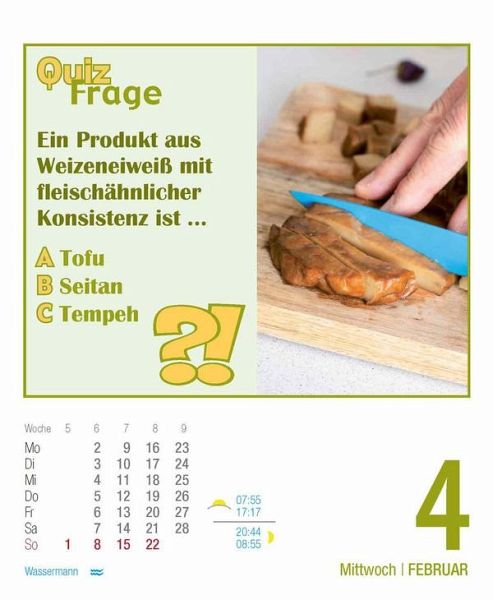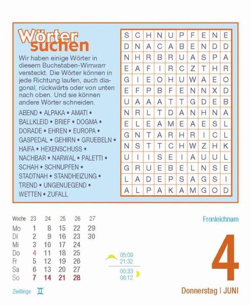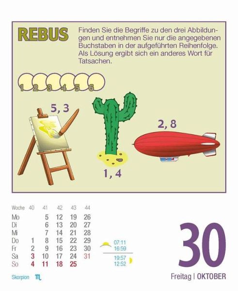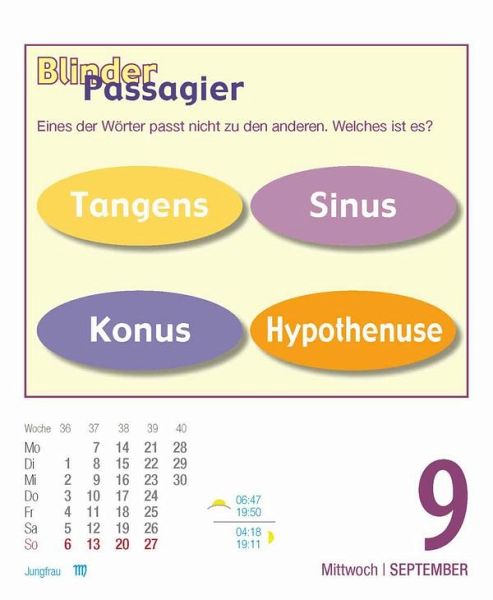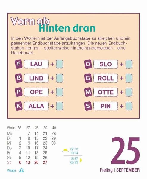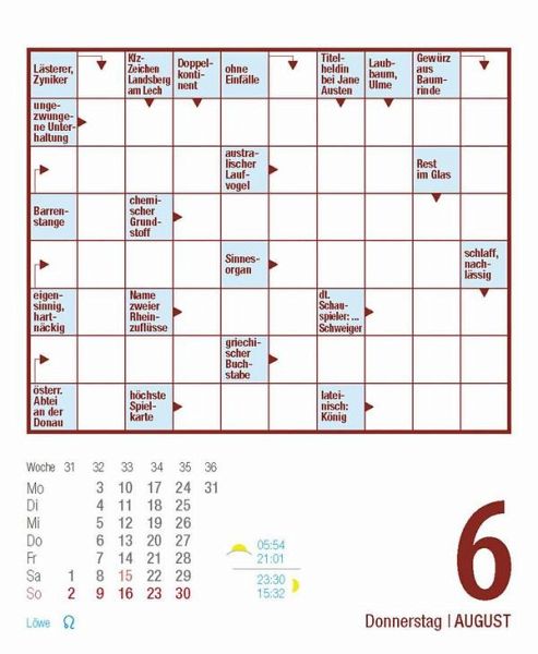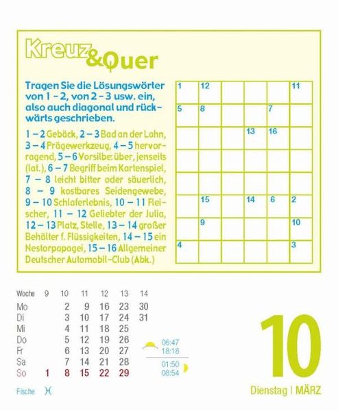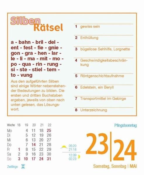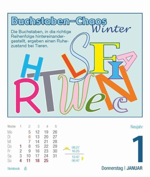 Kalender zum Aufstellen oder Aufhängen. Je Wochentag ein Kalenderblatt, Samstag/Sonntag auf einem Blatt.