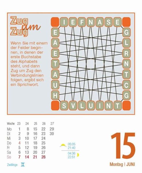 Je Wochentag ein Kalenderblatt, Samstag/Sonntag auf einem Blatt.