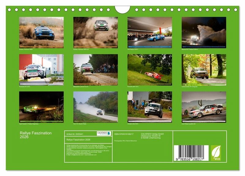 Der Rallye-Sport zeichnet sich vor Allem durch die breite an Fahrzeugen und die Nähe zu den Fans aus. Dieser Kalender ist durch seine Vielfalt von Eindrücken der Rallye ganz nah und begleitet jedes Team, jeden Fahrer und Fan dieses einzigartigen Sports durch das ganze Jahr.