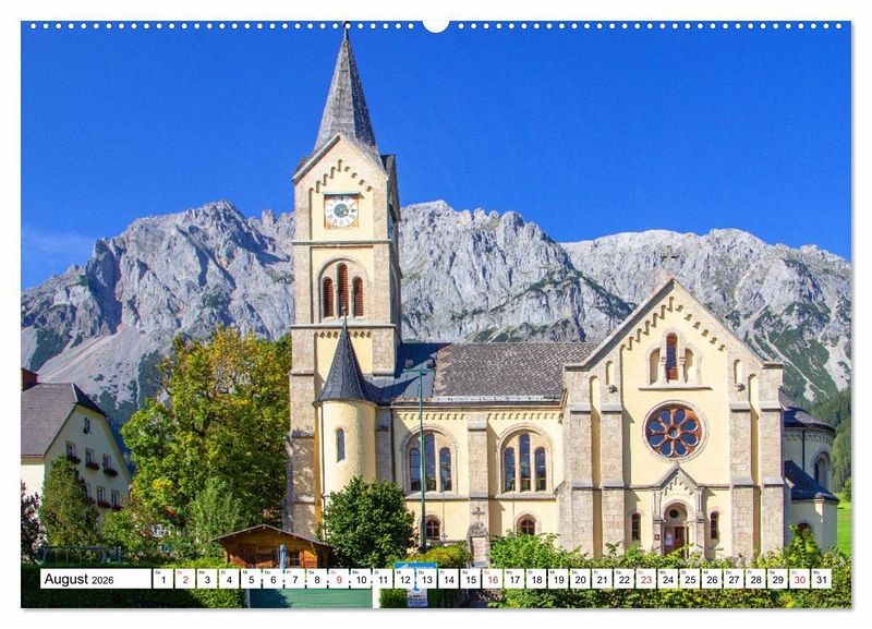 August: Evangelische Pfarrkirche vor der Kulisse des Dachsteins