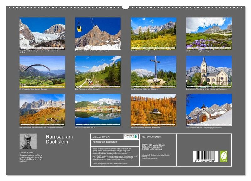 PREMIUM-LINIE - Brillanter Fotokalender mit 12 wunderschönen Motiven, Kunstdruck in Hochglanz in Museumsqualität.QUALITÄT - edle Materialien, stabile Rückwand mit 2 innovativen Einstecktaschen für eine optimale Präsentation an der Wand.NACHHALTIG - deutliche Abfallreduzierung durch bedarfsgerechte Einzelstückfertigung, umweltfreundliches FSC-zertifiziertes Papier, Produktion in Deutschland, klimabewusste Logistik.PERFEKTES GESCHENK - Kalender für Freunde und Familie, für Kinder und Erwachsene, jung und alt, zu Weihnachten, Geburtstag oder zwischendurch.Impressionen von der Ramsau am Dachstein von Autor(in): Christa Kramer
