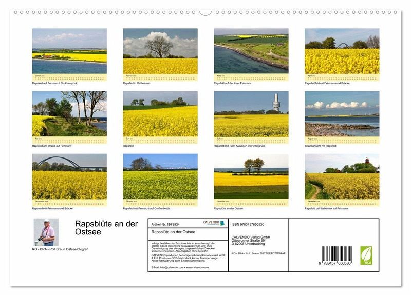 PREMIUM-LINIE - Brillanter Fotokalender mit 12 wunderschönen Motiven, Kunstdruck in Hochglanz in Museumsqualität.QUALITÄT - edle Materialien, stabile Rückwand mit 2 innovativen Einstecktaschen für eine optimale Präsentation an der Wand.NACHHALTIG - deutliche Abfallreduzierung durch bedarfsgerechte Einzelstückfertigung, umweltfreundliches FSC-zertifiziertes Papier, Produktion in Deutschland, klimabewusste Logistik.PERFEKTES GESCHENK - Kalender für Freunde und Familie, für Kinder und Erwachsene, jung und alt, zu Weihnachten, Geburtstag oder zwischendurch.Jahreszeit im April - Mai mit Rapsblüte an der Ostsee von Autor(in): RO- BRA- OSTSEEFOTOGRAF