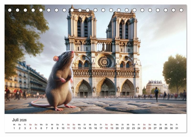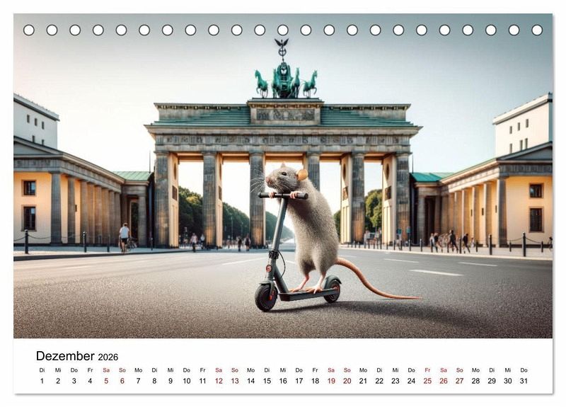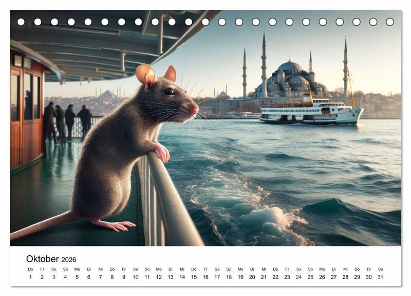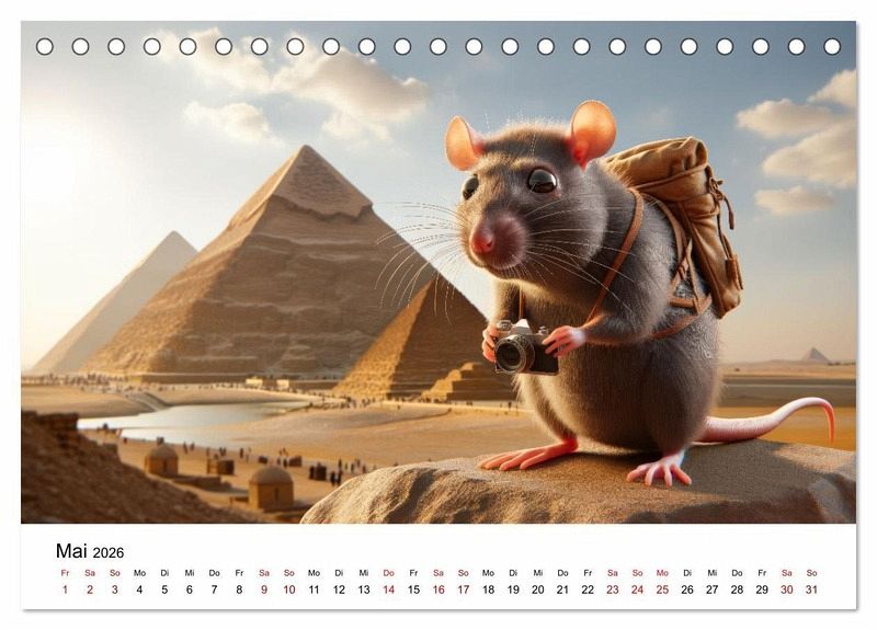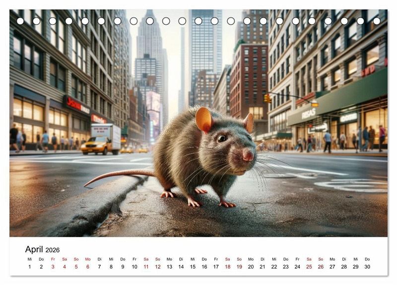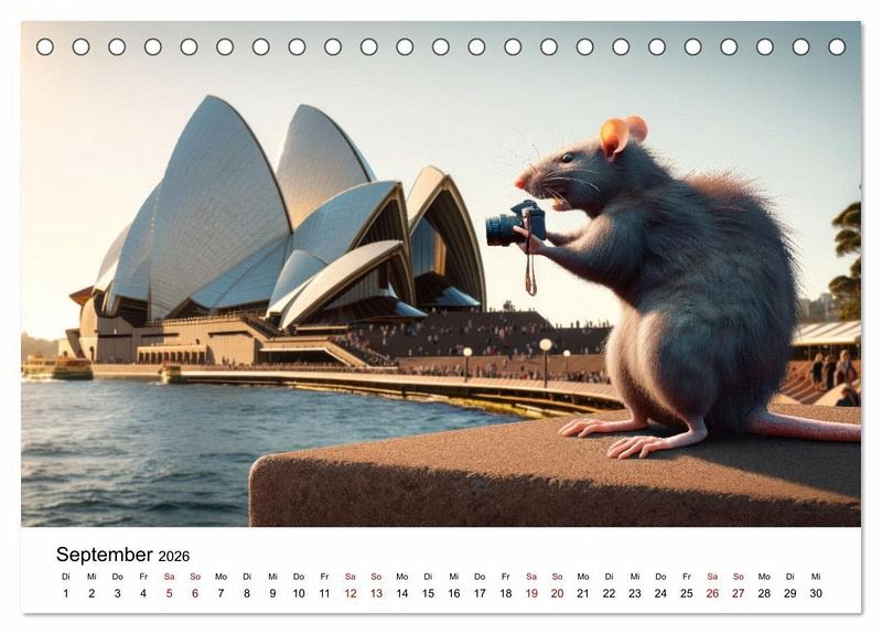 Jedes durch künstliche Intelligenz erzeugte Bild zeigt eine Ratte in einer anderen berühmten Stadt. Die Ratten sind dabei humorvoll in menschenähnliche Aktivitäten eingebunden, wie das Fotografieren, das Betrachten von Sehenswürdigkeiten oder das Reisen. Der Kalender verbindet auf einzigartige Weise die bekannten Wahrzeichen der Welt mit dem charmanten und abenteuerlustigen Charakter, was ihn zu einem unterhaltsamen und ansprechenden Zeitmesser für das Jahr macht.