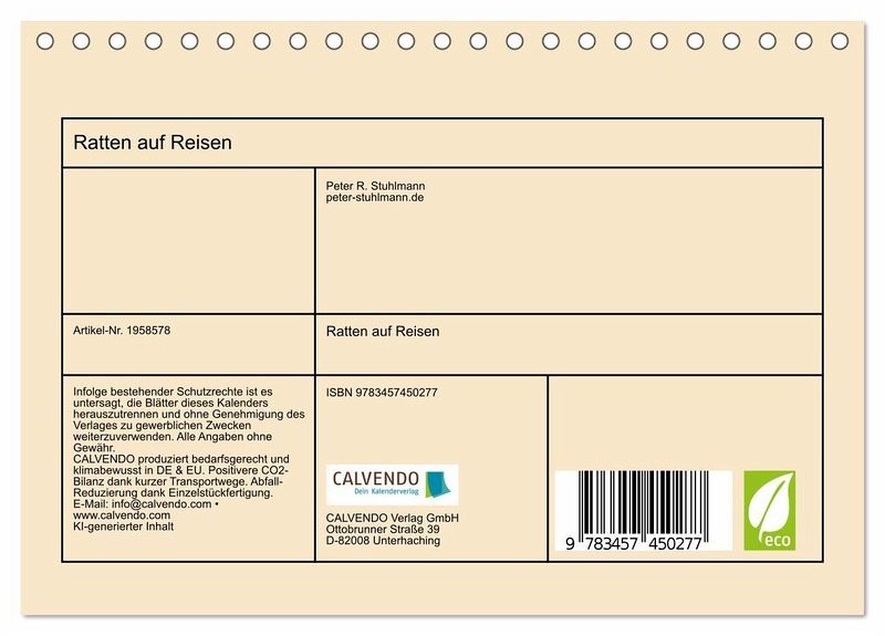 QUALITÄT - Hochwertiger Fotokalender mit 12 wunderschönen Motiven auf lichtbeständigem Bilderdruckpapier, robuste Spiralbindung.NACHHALTIG - deutliche Abfallreduzierung durch bedarfsgerechte Einzelstückfertigung, umweltfreundliches FSC-zertifiziertes Papier, Produktion in Deutschland, klimabewusste Logistik.PERFEKTES GESCHENK - Kalender für Freunde und Familie, für Kinder und Erwachsene, jung und alt, zu Weihnachten, Geburtstag oder zwischendurch.VIELFALT - Bildkalender in verschiedenen Formaten, z.B. DIN A5, DIN A4, DIN A3 sowie DIN A2. Ob Naturmotiv, Gemälde oder Fotos, ideal für ein persönliches Wohlfühlambiente.Humorvoll gestaltete Ratten in berühmten Reisedestinationen von Autor(in): Peter R. Stuhlmann
